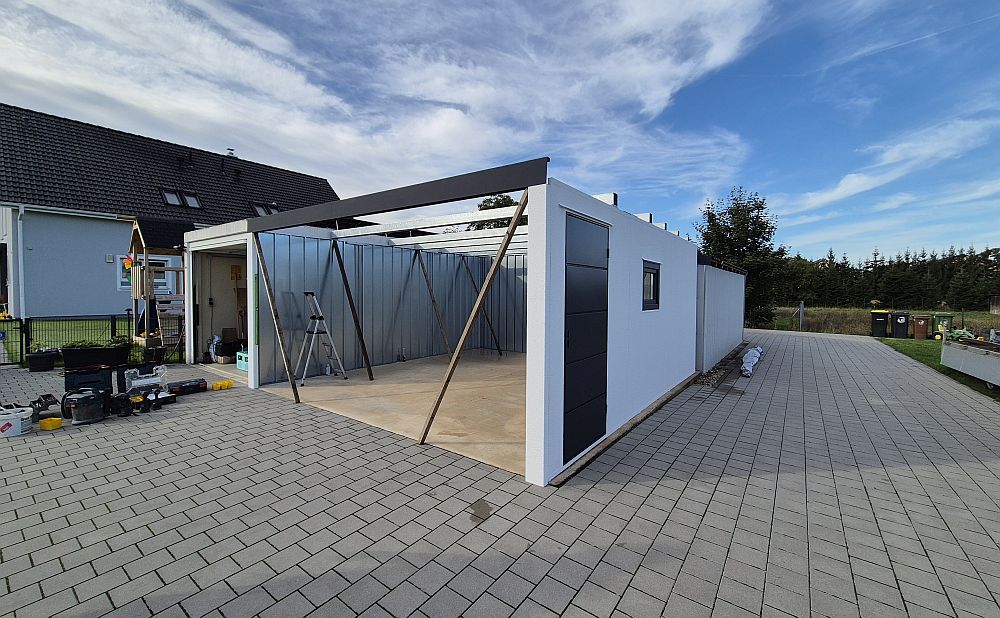 Auch mit Carports können wir weiterhin unsere Kunden zufriedenstellen. So wie in diesem Falle hier in Eilenburg. Die Kundin entschied sich für ein Doppelcarport mit seitlicher Verkleidung in Sinusprofilvariante.
