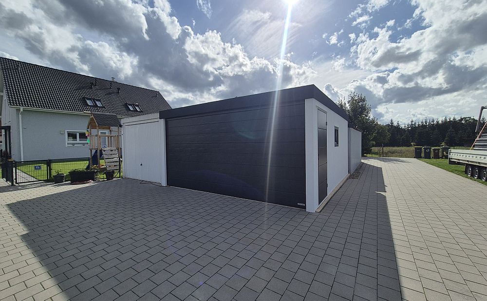 Diese Garagenanlage mit einer Breite von 12 Meter und eine Tiefe mit je 6 Meter wurde in der Nähe von Jena montiert. Die beiden Sektionaltore sind mit bluetoothfähigen und antriebsstarken Motorköpfen ausgestattet.