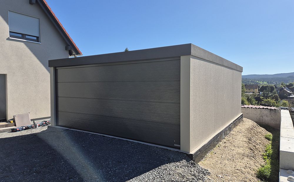 Ein weiterer Kunde erfreut sich an seiner Premium-Stahlgarage. Gefertigt wurde die Garage in Hausfarbe. Die Sockelfarbe des Wohnhauses wurde bei der Blende aufgegriffen. In der Garagenrückwand befindet sich ein Fenster und in der linken Seitenwand eine Nebeneingangstür.