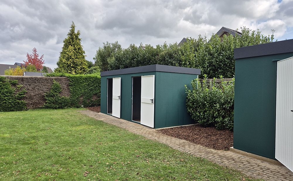 Als Abstellraum für Gartenwerkzeuge und weitere Gegenstände eignet sich dieser Premiumgeräteraum bestens. Die Nebeneingangstür und das Sektionaltor sind ansichtsgleich. Die Besonderheit bei diesem Projekt liegt im seitlich verlaufenden Dachgefälle.