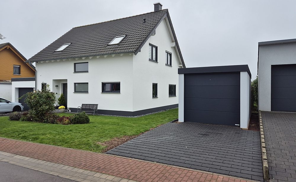 Da aufgrund der Bodenbeschaffenheit kein Keller im Wohnhaus möglich war, entschied sich unser Kunde aus Essen für eine Wolff Premium Stahlgarage. Passend zum Design der Fenster und Türen seines Hauses wählte er auch das Tor und die Tür der Garage – für ein harmonisches Gesamtbild.