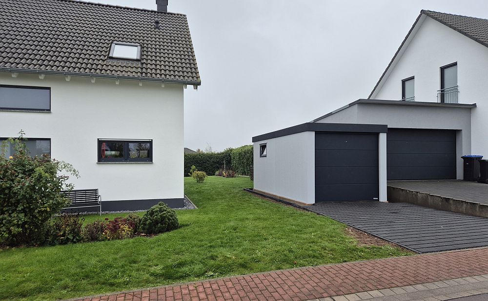 Mit einem Vordach von 35 cm und einem seitlichen Überbau von ca. 50 cm ist diese Garage etwas ganz Besonderes. Das 5 Meter breite Sektionaltor in anthrazit und mit der L-Sicke fügt sich perfekt ins Gesamtbild hinein.