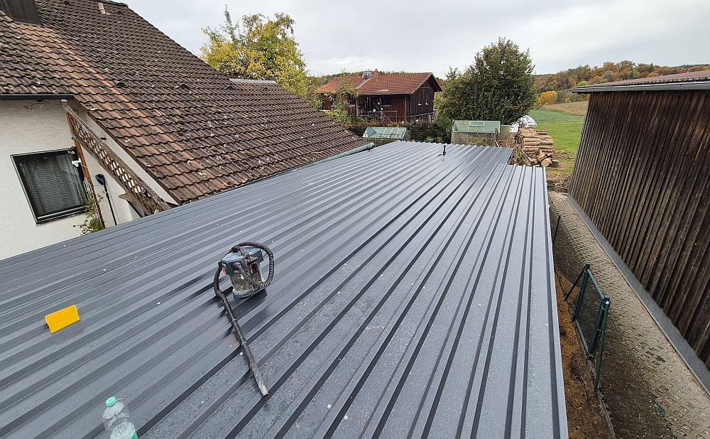 Lange Garagen brauchen lange Dachbleche. Wir liefern bis zu 14 Meter lange Bleche, ganz ohne Stückeln – und das schützt vor Undichtigkeiten. Qualität, die hält! Diese schöne Doppelgarage mit Anbaucarport hinten ist ganze 12 Meter lang.